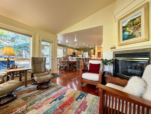 The inviting living room centers around a warm gas fireplace, perfect for cozy evenings and creating a welcoming atmosphere. Sink into comfortable seating as you share stories or plan your Montana adventures. The fully equipped kitchen caters to both casual and gourmet cooks alike, featuring ample counter space, a dining area for 6, and additional bar stool seating at the counter.