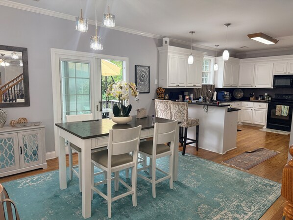 Gourmet Kitchen Excellence: A chef's dream, our fully stocked kitchen boasts ample counter space, high-end appliances including a dishwasher, flat-top electric stove, and a refrigerator with an ice machine. You'll find everything from a full set of cookware, plates, and silverware to olive oil, seasonings, a Keurig with complimentary K-cups (including decaf!), and even kid-friendly cups. Your culinary adventures await!