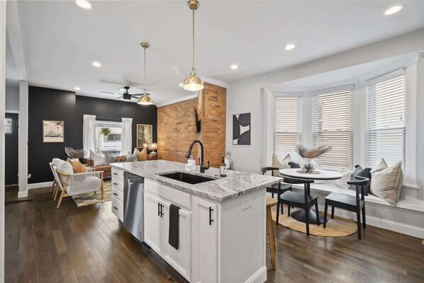 Chef-Inspired Kitchen: Open layout with a large island, bar seating, granite countertops, and a quaint dining nook — ideal for family meals or entertaining.