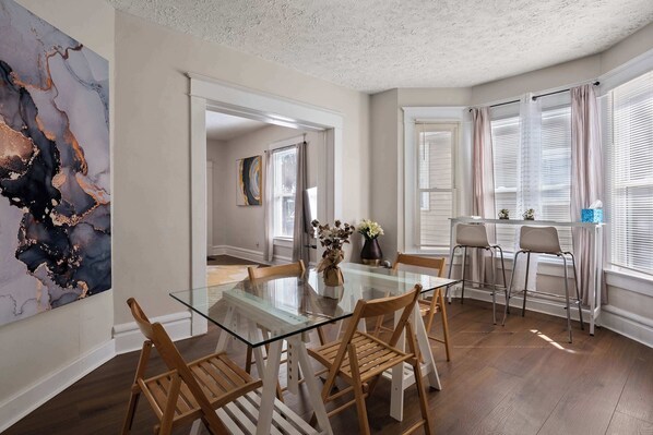 As you step through either unit, the bright, open kitchens offer plenty of counter space for preparing home-cooked meals and convenient Keurigs to fuel your adventures. Whether whipping up a quick breakfast or gathering for dinner, Summit Scholars 2 provides ample seating, including a high-top table for two, counter seating for two, and a dining table for four, while Summit Scholars 1 has a dining table for four, with an additional high-top table for two. For those who need to balance work with leisure, both units have a dedicated home office providing a quiet and productive space, allowing you to stay connected before heading out to explore the city.