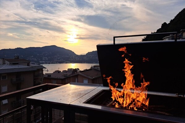 The wonderful terrace will take your breath away! With its 30 square meters, suspended between the sky and the lake, it is furnished for outdoor living throughout the summer, with armchairs for coffee and aperitifs, an outdoor kitchen with sink, and a large table for 6 where you can enjoy the spectacular view. There is also a barbecue for grilling under the stars.