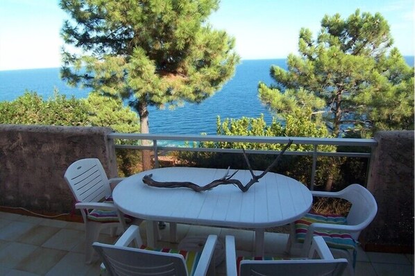 Terrasse direkt am Meer: Gartenmöbel, Sonnenschirm, Grill