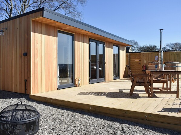 Shower Room: Walk-In Shower, Heated Towel Rail, Toilet. LPG heating, electricity, bed linen, towels and Wi-Fi included. Welcome pack. Initial logs for hot tub included, remainder at £5 per bag.. Decked area with garden furniture and firepit. Wood-fired tub for 2 (private). Courtyard to front with bench and table and chairs. Lawned area with picnic bench (shared with other properties on-site). Tennis court (shared with other properties on-site). Private parking for 1 car. No smoking.. This fabulous wooden lodge has a cosy open living/dining/kitchen/bedroom area, boasting a Smart TV and comfortable furnishings and fittings to ensure you will feel right at home. There is also a large patio door leading out to your decked area, complete with a fire pit and a wood-fired tub. Boasting views over the picturesque countryside beyond, it makes the perfect spot to enjoy a morning coffee whilst you plan your day.