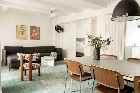 Between the lounge area and kitchen is a dining table that seats all of you comfortably. The space also has a nice and comfortable couch that doubles as a sofa bed for one, as well as an easy chair. There is also a French balcony that opens into the courtyard and a TV.