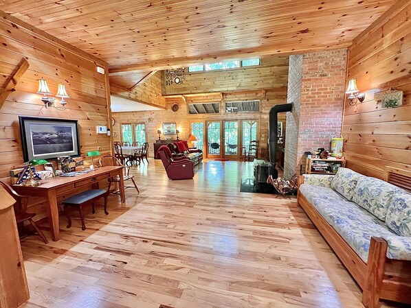 The main living area is located on the middle floor of the cabin which requires the use of stairs. The main living area is open concept with a living room, kitchen, dining table, and wood-burning heater. The king suite is located off of the living room as seen in pictures with a TV and a full private bathroom. This floor also features a sofa bed (white & blue floral sofa), laundry room, half bathroom, and dog room. The dog room includes a large crate, bedding, food bowls, and blankets. The dog room opens up to a fenced-in area around the cabin.