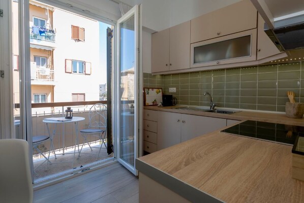 Inside, the apartment includes a fully equipped kitchen with an oven, fridge/freezer, kettle, toaster, cooking utensils, and all the essentials for preparing meals. The living room provides a comfortable place to gather, while the balcony is perfect for enjoying morning coffee or evening views. Amenities include air conditioning, heating, Wi-Fi up to 24 Mbps, a washing machine, TV, and fresh linens, towels, soap, and shampoo. The bathroom has a modern shower, and the property uses an electric boiler that typically needs 15–20 minutes to heat the water. The entrance is simple with two steps, free street parking is available nearby, and a baby cot or highchair can be provided on request. A keybox makes check-in convenient.