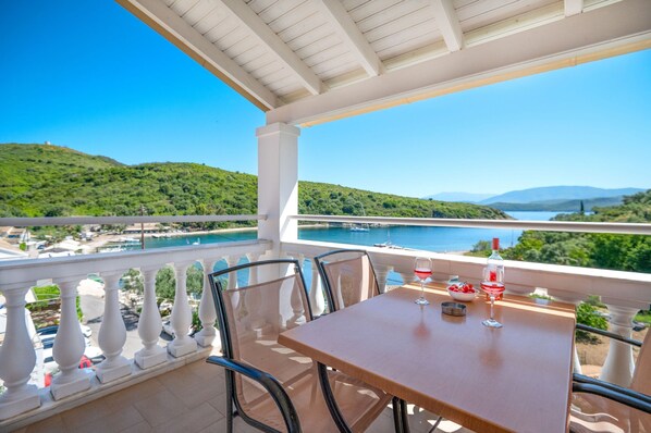 Overview: Renoula comprises two cozy, air-conditioned bedrooms, an open-plan living and dining area with a fully equipped kitchen, a family shower room with a WC, and an additional family bathroom with a shower and WC. To top it off, both bedrooms are equipped with air conditioning to ensure your comfort. The covered sea-facing balcony offers a truly enviable vantage point, affording breathtaking views of the bay below and extending as far as the picturesque Albanian coastline.