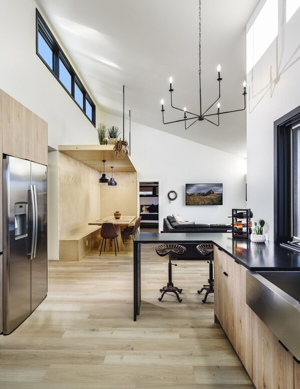 This modern sanctuary spans 2.6 acres where Oak Creek runs gold with reflected cottonwoods. The open-concept design frames views that past guests call 'breathtaking in October light.' Your gourmet kitchen invites harvest cooking with herbs from the local farms, while four bedrooms (including the kids' beloved bunk room) accommodate nine in comfort.