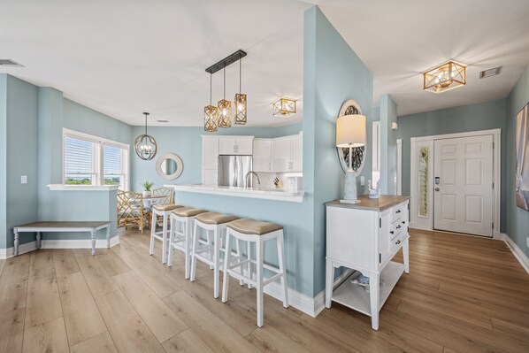 Sie werden sich in dieser geräumigen Golfvilla-Eigentumswohnung in der obersten Etage im The Currituck Club ganz oben auf der Welt fühlen! Genießen Sie die Meeresbrise, während Sie auf den weitläufigen Decks mit Blick auf den Atlantik im Osten, Süden und Westen bis zum Currituck Sound entspannen. Der Aufzug befindet sich in der Nähe, um den Gästen einen einfachen Zugang zu ermöglichen, während die begrenzte Anzahl von Einheiten in diesen Villen ein ruhiges Gefühl der Privatsphäre bewahrt.