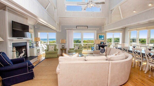 Top Level: Large open great room with large flat-screen TV/Blu-Ray DVD, gas fireplace and deck access, dining room seating 11, kitchen with counter seating for 5 and a half bath.