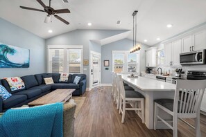 This beautifully decorated beach home has been outfitted to accommodate you, your friends and family for a memorable get away! Whether you bring a dog, grandparents, or a Friend or Family member with differing needs, we have tried to include everything you might need in a 2 Bedroom/2 Bathroom Vacation Oasis! Step into a large open concept Family Room/ Kitchen where you, your family and friends will create memories for years to come. The amazing fully outfitted kitchen features a full suite of stainless steel appliances including a full size side by side refrigerator /freezer, on the door ice maker, dishwasher, disposal, DOUBLE Oven (upgrade), Keurig and drip coffee makers, and an abundance of Shaker Style storage cabinets. You will love the 9 Foot Kitchen Island (with seating for 6) covered in a beautiful Corian surface perfect for eating, working, Zooming or playing games with your Family and Friends.