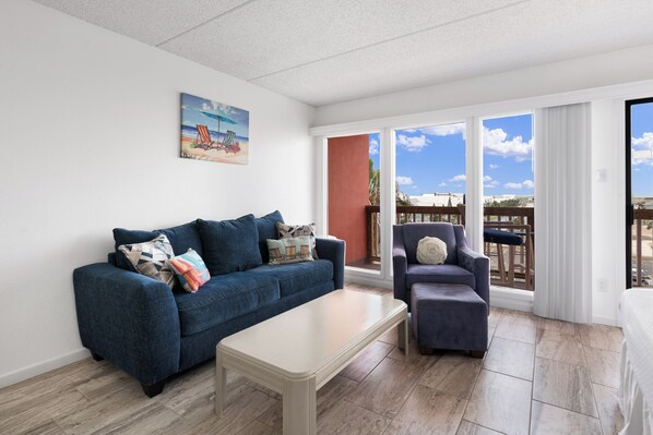 Escape to your perfect getaway in this charming fifth-floor poolside studio! Step out onto your private patio overlooking the sparkling pool or fire up the BBQ grills for a delicious cookout. At 550 square feet, this cozy retreat boasts a fully equipped kitchen and a full bathroom. Rest easy on the comfy king-size bed perfect for up to 2 guests, and just steps away, the gorgeous beach awaits, so you can enjoy sun, sand, and surf whenever you like. Your fun-filled, relaxing vacation starts here!