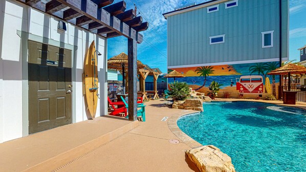Be the first to book this new three-story townhome located in the Endless Summer Resort, just 0.9 miles to the beach and 0.3 miles to restaurants, shops, and nightlife. The heart of the home (kitchen/living/dining and master bedroom) is located on the second level. The open floor plan, ceramic tile floors, and tall ceilings are perfect for everyone to come together and entertain. The kitchen is sure to please all chefs with plenty of lighting, granite countertops, cabinets, stainless steel appliances, a Keurig coffee maker, dishes, basic pot pans, and utensils. Dine beside the large window at the table with seating for four and additional stools for four more at the breakfast bar. Gather guests in the living room to watch a movie on the wall-mounted TV while seated on the couch and four matching accent chairs. After a full day at the beach or in town, retreat to the master bedroom (BR1) consisting of a King bed, nightstands, bench, closet, and wall-mounted TV. The ensuite bathroom holds a large tile stand-alone shower and vanity. Up the stairs, to the third level, you will find the remaining bedrooms and a shared living area. The guest bedroom (BR2) contains a Queen bed, nightstands, closet, and wall-mounted TV. The ensuite bathroom includes a spacious vanity and a large shower with a bench which is also accessible from the hallway. Kids will love the bunk room (BR3) made up of two Twin over Twin bunk beds, a closet, a wall-mounted TV, and plenty of room to play. The private bathroom has a vanity and tile tub/shower. The shared living room provides an area to unwind on the futon while watching the wall-mounted TV or catching up on school or work tasks at the corner desk with natural lighting from the nearby windows. Take in the breathtaking views of Port A and partial views of the ocean from the canvas-covered observation deck from this level. It can also be accessed from the outdoor spiral staircase. Head over to the shared pool, which is heated in the winter months, with a grotto and jetted ledge to cool off after a day at the beach. Sit under one of the multiple palapas with outdoor seating and picnic tables while drying off in the ocean breeze. Bring your family and friends to enjoy the island time state of mind.