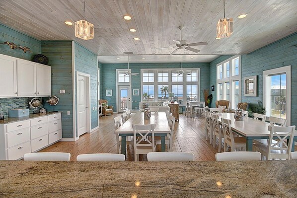 Banyan Breeze ist ein luxuriöses 3-stöckiges Ferienhaus an der Golfküste in exklusivem Banyan Beach. Es liegt in der Nähe von Restaurants, Geschäften und dem Yachthafen in Port A. Der Strand ist nur wenige Schritte von unserem privaten Spaziergang entfernt und der Pool befindet sich direkt nebenan. Das Haus verfügt über 3 große Etagen, 4 geräumige King Master Suiten und eine Gesamtfläche von 3550 Quadratmetern. Es bietet Platz für bis zu 18 Gäste, sodass Sie viel Platz für mehrere Familien, Familientreffen oder große Gruppen großartiger Freunde haben. Dieses Strandhaus verfügt über 8 HD-Flachbildfernseher, WLAN, 2 DVD-Player und eine Stereoanlage mit Surround-Sound. Die überdachten Decks mit Blick auf den Golf bieten einen spektakulären Blick auf das Wasser einschließlich des Schiffskanals. Alle Ebenen des Hauses sind über einen leicht zugänglichen Aufzug sowie über Innentreppen an den Eingangstüren miteinander verbunden. Beide Eingangstüren sind für Rollstuhlfahrer behindertengerecht. Die erste Etage verfügt über 2 Kingsize-Master-Suiten mit eigenem Bad und ein Spielzimmer mit Küchenzeile, Essbereich, HDTV und Queensize-Schlafsofa. Die 2. Etage verfügt über 4 Schlafzimmer, darunter 2 Master-Suiten, die sich ein 10-Fuß-Deck mit Blick auf den Golf teilen. Diese haben auch Kingsize-Betten und ein eigenes Bad. Das 3. und 4. Schlafzimmer teilen sich ein Vollbad. Eines verfügt über ein Kingsize-Bett, das andere über 2 Etagenbetten und ein Schlafsofa. Alle Schlafzimmer haben HD-Fernseher. Die vollständige Waschmaschine / Trockner befindet sich in der 2. Etage neben einer Kaffeemaschine. Die obere 3. Etage bietet einen spektakulären Blick auf den Golf und verfügt über einen großen offenen Wohnbereich mit Esszimmer, Küche und Gästetoilette. Der geräumige Wohnbereich hat 12 Fuß Decken für eine schöne Aussicht und lebenslange Erinnerungen. Das CLOUD-Schnittsofa, ein Spieltisch mit Stühlen und zusätzliche Sitzgelegenheiten sind ebenfalls vorhanden. Der Essbereich ist mit 2 großen Tischen ausgestattet, die getrennt oder kombiniert werden können und Platz für bis zu 20 Gäste bieten. Auf der großen Granitinsel stehen 6 zusätzliche Thekenplätze zur Verfügung. Die gut ausgestattete Küche verfügt über Küchengeräte aus Edelstahl und ist ideal für die Unterhaltung einer großen Familiengruppe. Die riesige überdachte Terrasse ist ein Treffpunkt, um die Golfbrise mit Sofas im Freien zum Entspannen für Freunde zu genießen. Sie haben ein Spielzimmer mit Tischfußball und elektronischen Darts in einer Garage. Sie werden sich wie im Urlaub in den Tropen fühlen mit Banyan Breezes leuchtenden Farben und Golfküstendekor. Die Hausverwaltungsgesellschaft Port A Escapes bietet den besten Kundenservice. Maximal 5 Autos können an diesem Haus geparkt werden. Kommen Sie und erleben Sie den Luxus von Banyan Beach für Ihren nächsten Urlaub! Für eine virtuelle Tour klicken Sie hier STR # 2000114022