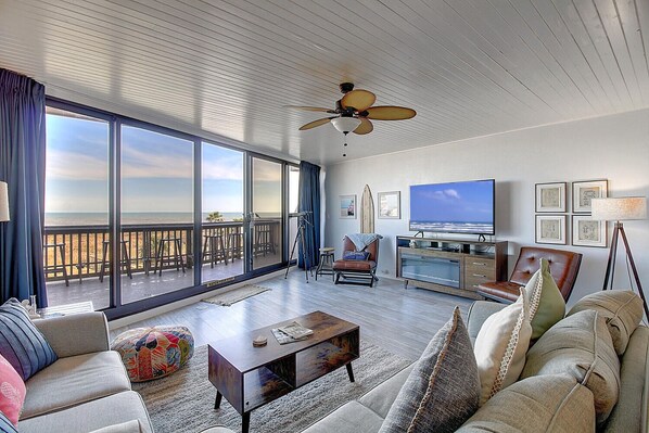 MP305 has been recently updated throughout. This Coastal chic condo features an abundance of beach side ambiance via massive oceanfront living room windows. Lounge on the balcony with your favorite beverage to experience the best sunrises and sunsets in Port Aransas. The living area has a queen sleeper sofa, love seat, comfy occasional chairs, ceiling fan, wood ceilings, and a 55” HDTV with cable. For added convenience, there is a half bath and washer/dryer located on near the entry.