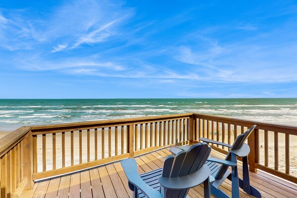 The kitchen is well stocked and there were toys and chairs to take down to the beach. The beds and pillows are comfortable. The boardwalk was right there and the walk is very short. The showers have detachable heads making it easy to bathe younger children. Outdoor/indoor furniture is comfortable. The view just can’t be matched. There were a few issues. First, the windows were covered in an ocean air film when we arrived. We had to clean the windows ourselves. Luckily there was a hose there and a squeegee to do that with. They did not get dirty for the rest of the time we were there so the windows hadn’t been cleaned in a minute. There were roaches. That’s expected in south Texas in the summer. But I drew the line when I found baby ones in the master bed. With the exception of the master bath, the showers and bathrooms are very tiny. There was someone else’s hair in the master bath drain cover. I’m very concerned about the structural soundness of the master tub/shower. There is a definite low spot in it that pops sometimes when you step in just the right spot. When I pulled the sheets off, there were stains on the mattress cover that is zipped onto the mattress and on the pillows. The sliding door on the second floor is difficult to close and lock. Despite those issues, the view would bring us back again. They were so small in comparison. Besides, you’re just there temporarily so it’s not a deal breaker. We plan on returning. That view is everything.