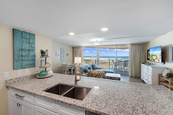 As you enter the unit, your eyes will feast the beautiful coastal décor/furnishings and embrace a full view of the beach and the beauty of the sky as you are “one”. What a wonderful world! During your stay, your senses will awaken with the Sight and Sounds of: