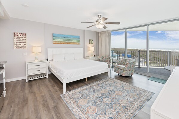 The open living space features modern, upscale furnishings throughout including a king size bed with luxurious mattress and resort quality linens, two drawer nightstands, a six drawer dresser, swivel glider chairs, dining table for two, 50" flat screen TV and a stunning kitchen that will far exceed your expectations for an efficiency. The unit features upgraded cabinetry, granite counters, and modern, stainless steel appliances as well as everything you could need for cooking and serving meals. Cleaning up is a breeze with a built-in dishwasher.
