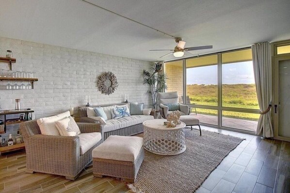 Seas The Day @ Coral Cay is a completely renovated 2 bedroom, 2 bath, beachfront condo at Coral Cay Beachfront Condominiums in Port Aransas, Texas. This first floor beach facing condo is just steps away from the walk over boardwalk to the beach. Remodeled post Hurricane Harvey with wood plank tile floors, fixtures, appliances, quartz counters in kitchen and baths, as well as, new impact resistant window walls overlooking the dunes. The in-unit washer & dryer offers added convenience to the coin operated laundry room used by the rest of the complex. Two shared swimming pools are available. The closest being out the entry door and across the parking lot.