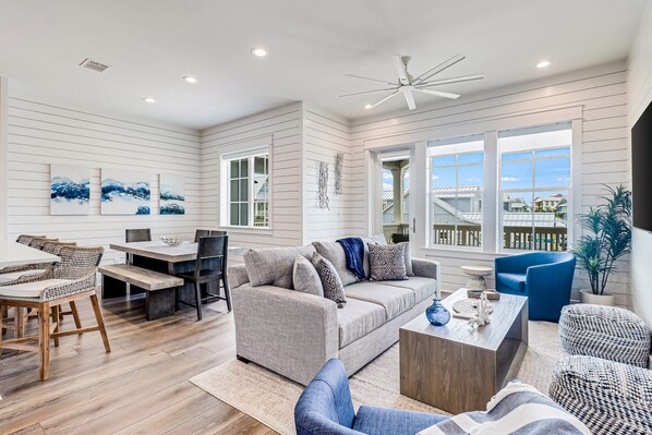 Inside, this sunlit getaway boasts shiplap walls, seaside colors and decor, and a variety of comfortable furnishings. Prepare all your favorite recipes in the well-equipped, full kitchen complete with a suite of stainless steel appliances (including a gas stove), and then dine at the breakfast bar or gather for mealtimes or board games at the nearby table. After meals, watch the sunset out on your furnished balcony and then come back in to watch TV in your plush, main living area or up in the second living space located at the top of the stairs - perfect for younger guests.