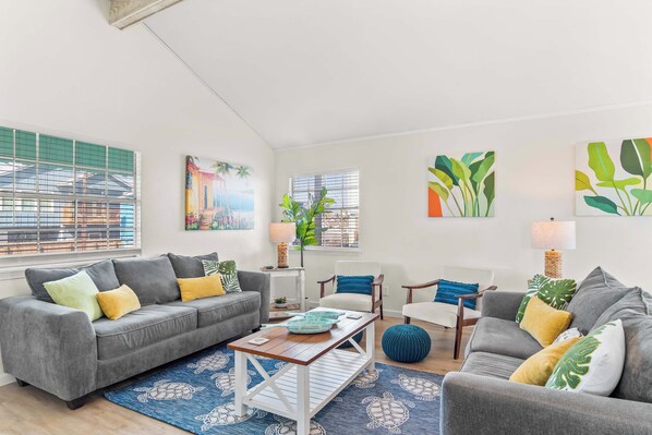 Inside this cheerful home, soaring ceilings sit atop open spaces filled with contemporary furnishings and island-chic décor, promoting both relaxation and connectivity. Plush sofa and armchair seating are a relief for your feet after long days exploring, where you can spend leisure time surfing the channels or queueing up a movie on the mounted TV. Steps away, the fully equipped kitchen showcases all-black appliances, glossy granite countertops, and sleek white cabinetry stocked with all the cookware and dining ware you need to whip up convenient meals at home. Dine together at the formal table with seating for 4 or grab a high-top stool at the counter for more quick and casual bites.