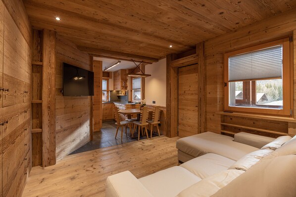Die Wohnung ist 60 m2 groß und befindet sich im ersten Stock einer schönen Villa. Der Wohnbereich besteht aus einer Lounge mit einem bequemen Sofa und einem großen LCD-TV, einem Esstisch und einer ausgestatteten Küchenzeile mit Induktionskochfeld, Backofen, Kühlschrank, Gefrierschrank und Geschirrspüler. Der Schlafbereich besteht aus zwei Schlafzimmern, einem Doppelzimmer mit großem Kleiderschrank und TV und einem Schlafzimmer mit zwei Einzelbetten und Zugang zum Balkon. Das Badezimmer hat eine große Dusche mit Türkischem Bad. Wi-Fi-Verbindung und ein Parkplatz im Freien stehen zur Verfügung. Ideale Wohnung für Familien, die einen komfortablen und ruhigen Urlaub in Cortina d'Ampezzo verbringen möchten.