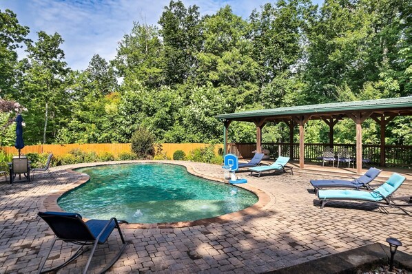 Step outside to enjoy the private seasonal pool (open Memorial Day to Labor Day), soak in the 6–8 person hot tub, or unwind in the shaded lounge area with ceiling fans and two picnic tables for alfresco dining. A propane grill and firepit complete the outdoor experience.