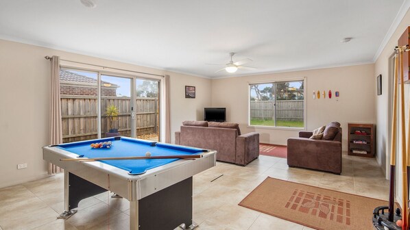 An den Essbereich in der Küche schließt sich ein großer Unterhaltungsraum mit Billardtisch, TV, DVD-Player und Sitzbereich an. Viel Platz für die Kinder, um sich zu amüsieren. Dieser Bereich blickt auf den Hinterhof. In diesem Bereich gibt es auch ein anderes Umkehrzyklus-Split-System.