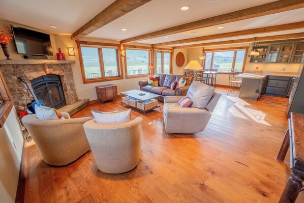 The main floor opens into a sprawling great room with a fireplace, seating and couch space for the whole gang, dining room and perfectly appointed modern kitchen with everything you need to bring out your inner-chef. The sliding glass doors next to the dining table take you out to the oversized back deck, complete with postcard views, gas grill, and direct access to the "Deli Trail" Town Ranch Biking/Walking/Skiing trail.