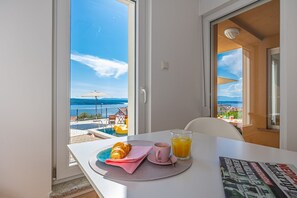 Mediterranes Apartment mit Meerblick, Privatpool, BBQ, Garage, Waschmaschine