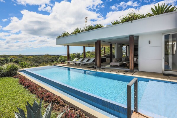 Discover Villa Luna in Playa Azul’s exclusive Ruby Sky neighborhood—where luxury meets nature and sustainability. Spanning over 7,000 sq. ft., this 4-bedroom, 3.5-bath villa hosts up to 8 guests in style and comfort. Each bedroom features a comfortable queen bed, ensuring a restful night's sleep for all guests. With 5 bathrooms, there's plenty of space for everyone to freshen up. AC is available to keep you cool during your stay. Enjoy a stunning infinity pool, unique décor, and spacious indoor-outdoor living areas. Professionally managed with concierge service, Villa Luna offers the perfect balance of wellness, adventure, and relaxation near pristine beaches.