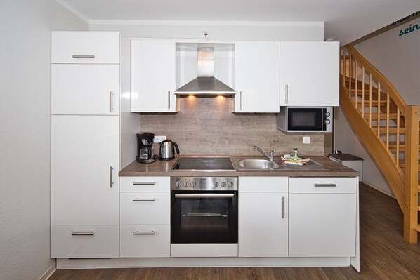3-Zimmer Maisonette Ferienwohnung am Grooten Steen 14 in Cuxhaven-Duhnen. Es erwartet Sie hier eine geschmackvolle und moderne 3-Raum Ferienwohnung im 1. Obergeschoss mit 2 Bädern und[nbsp] einem großzügigen Süd-Balkon. Auf den Balkon gelangen sie über den Wohn-/ Ess- und Küchenbereich. Dieser ist großzügig aufgeteilt und bietet Platz für bis zu 4 Personen. Die Küche ist komplett ausgestattet und lässt kaum Wünsche offen. Das ebenfalls geräumige Schlafzimmer ist mit einem komfortablen Boxspring Doppelbett und genügend Stauraum ausgestattet. Für den weiteren Komfort stehen Ihnen 2 Duschbäder mit WC zur Verfügung. Das 2. Duschbad mit WC befindet sich im Dachgeschoss, wo Sie auch das 2. Schlafzimmer mit 2 Einzel Boxspringbetten finden. Genügend Stauraum ist in beiden Schlafzimmern vorhanden. Weiteren Komfort erfahren Sie durch die tolle Ausstattung z.B. in Schlafbereich im DG mit TV.