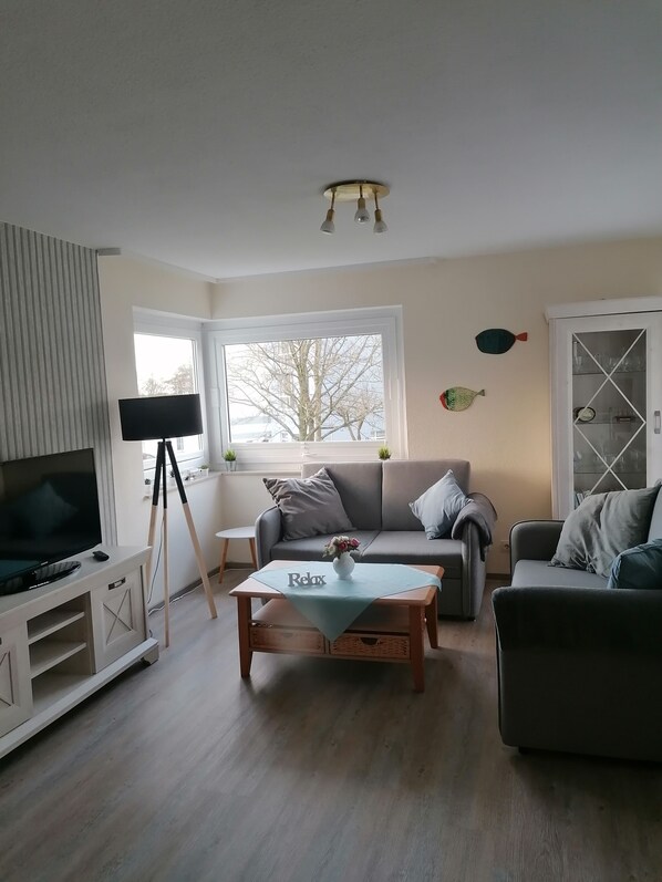 Die gemütlich eingerichtete Wohnung mit einem Wohn-Essbereich, einer Schlafnische, ausgestattet mit 2 Bocksspringbetten kann zu einem großen Bett zusammengestellt werden, einer Essecke mit Küchenzeile mit einem separaten 2er Induktionsherd,einem Kühlschrank mit Eisfach, Kaffeemaschine, Wasserkocher, sonstigen Küchenutensielien und Geschirr für 3 Personen. Das Bad ist mit WC Dusche ausgestattet