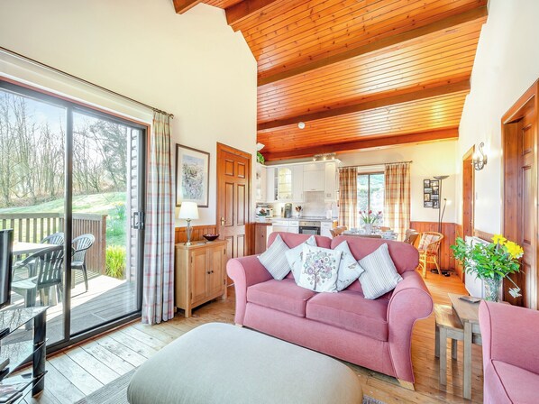 Entzückende Blockhütte mit Terrassentüren zur Terrasse, ideal für Mahlzeiten im Freien, Golfer werden den angrenzenden Golfplatz lieben.