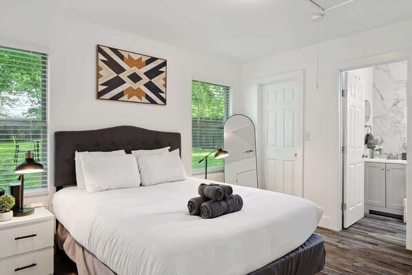 • Bedside tables, lamps, and stylish artwork