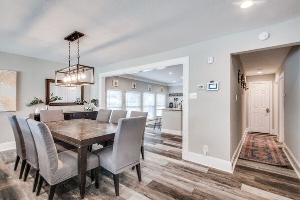 We stayed before and after our daughter's wedding with immediate family members at the house. The house has just minutes from the airport, hotels, church wedding, rehearsal dinner and reception making it the ideal location to meet and relax between activities. The outdoor games and BBQ, spacious kitchen, large dining area and entertainment area allowed food to be prepared, and family/friends to eat, meet and visit.