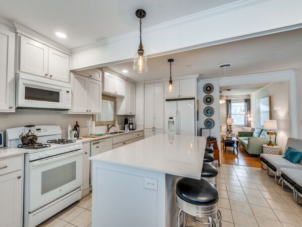 07 Kitchen, chef's delight. Lots of room to prepare food on the quartz island. Charging station at back counter (and also in office) with European conversion chargers available.