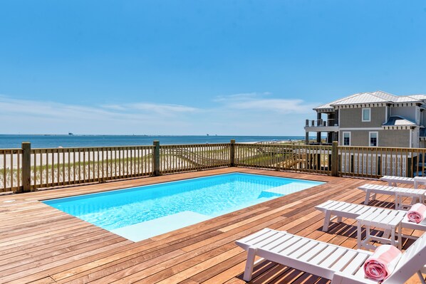 Coastal Charm, 327 Audubon Place, new home located in a private, gated Gulf Front community. Unobstructed views, white sandy Beach. Private Pool. Comfortable furnishings. Easy access to the island-wide bike trail, Fort Gaines, Alabama Aquarium and the Dauphin Island Bird Sanctuary for those looking for a beach vacation with other fun things to do!