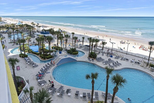 Spectacular Direct Oceanfront Condo lets you wake up and watch the sunrise with front row seats. This condo contains two double beds in the primary bedroom and a queen sleeper in the living room. New flooring, two new flat screen TVs and free Wi-Fi in the condo! Direct Oceanfront View! Private full one bedroom, private oceanfront balcony with spectacular view of the beach, pools, band shell and pier.