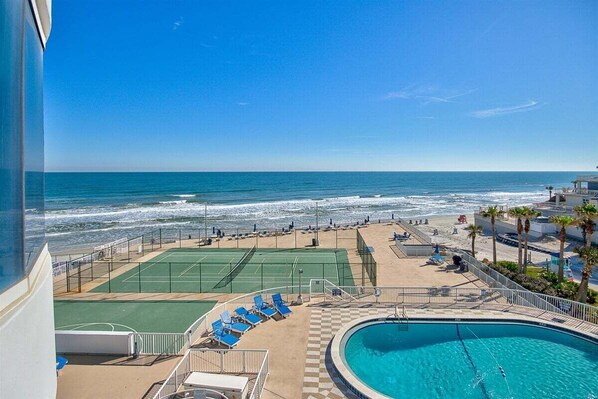 As a guest at Peck Plaza, you'll have access to a wealth of resort-style amenities, including a sparkling oceanfront swimming pool, tennis courts, fitness center, sauna, and clubhouse. Spend your days soaking up the sun by the pool, playing a friendly game of tennis, or strolling along the pristine sandy beach just steps from your door. Conveniently situated in the heart of Daytona Beach, you'll be just minutes away from an array of dining, shopping, and entertainment options. Whether you're exploring the vibrant boardwalk, catching a race at the Daytona International Speedway, or simply relaxing on the beach, there's something for everyone to enjoy in this beloved coastal destination. Don't miss your chance to experience coastal living at its finest! Schedule your private showing today and start making memories that will last a lifetime in this spectacular oceanfront condo at Peck Plaza.