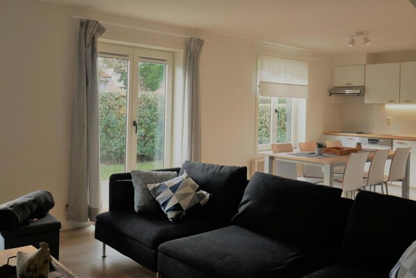 Als zusätzliches Plus gibt es einen gemütlichen Kamin im Wohnzimmer. Ein Schlafzimmer im Erdgeschoss mit einem großen Kingsize-Bett (Auping-Bett). Die Terrasse ist komfortabel mit Gartenstühlen und Sesseln ausgestattet (zusätzliche Sonnenschirme und Gartenstühle im Gartenhaus). Eine Klimaanlage ist vorhanden.