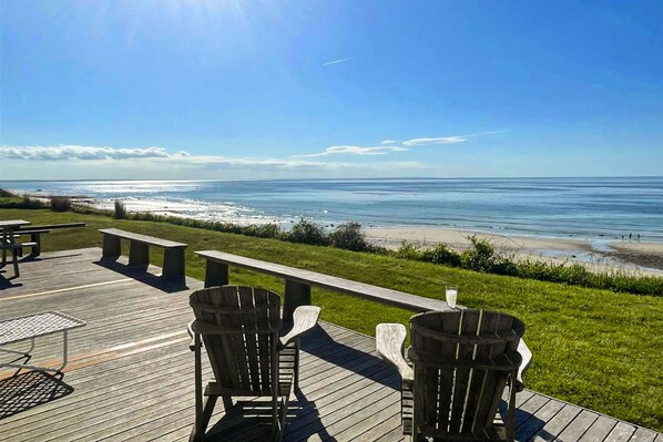 This gorgeous 1920s cape presents stunning sunrise/sunset vistas, with unobstructed bay views from Plymouth to Provincetown. Perched on roughly six wooded acres, your spacious escape boasts a 300-foot long private beach, a large lawn, and a generous cliffside landing. Perfect for al-fresco dining, a huge deck with a gas grill overlooks the water. Additional amenities include an outdoor shower as well as beach towels and chairs.