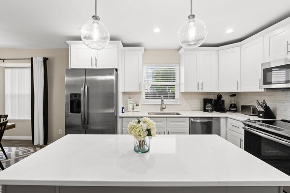 CUSTOM KITCHEN You'll enjoy making your favorite meals in this renovated custom kitchen featuring coastal cabinets, quartz countertops and stainless-steel appliances. It offers plenty of prep and storage space, including an island. You'll find most everything you'll need here including pots, pans, dishes, glasses and silverware, as well as a drip coffee maker, blender and toaster.