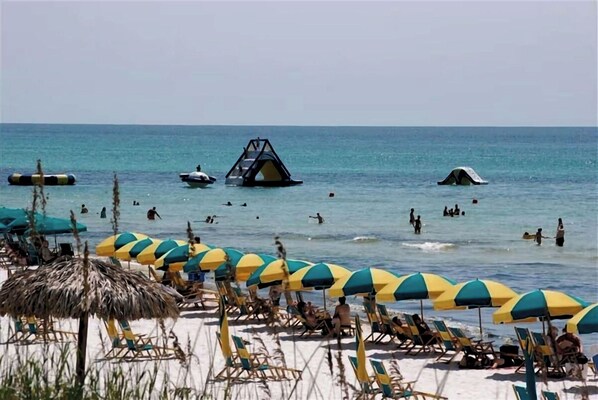 Located in the heart of Destin. The 4300 square foot Lagoon-style pool fronts your dedicated beach and features a mushroom fountain the kids love. There is a BBQ alongside if you're in the mood to grill; if not, the second pool features a convenient grill, serving delicious hot dogs, hamburgers, ice cream, and beverages. Or skip the pools, grab a soda, and hit the beach.