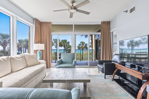 Living Room: Plush seating, large flat-screen TV, and direct access to the private beachfront balcony for morning coffee, sunset cocktails, or waveside relaxation.