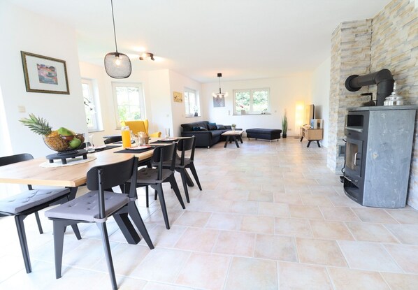 Der lichtdurchflutete Wohnbereich mit Leseecke, TV und Kaminofen schafft eine behagliche Atmosphäre – ideal zum Lesen, Entspannen oder für gemeinsame Abende. Die voll ausgestattete Küche mit offenem Essbereich macht das Kochen zum Vergnügen.