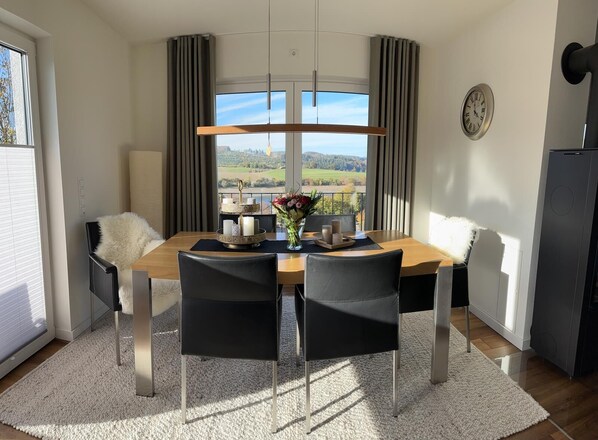Der offen gestaltete Wohnbereich mit Kaminofen, großem Sofa und Essplatz lädt zu gemütlichen Stunden ein. Durch die bodentiefen Fenster hast du freien Blick auf die umliegende Landschaft. Eine voll ausgestattete Küche steht dir für deine Urlaubsgerichte zur Verfügung – inklusive Spülmaschine, Backofen und Kaffeemaschine.