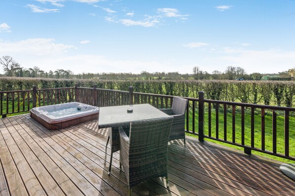 Contemporary luxury lodge with a king bed. Fully fitted kitchen, with hobs, oven, microwave, kettle, toaster, dishwasher, fridge/freezer and washer/dryer. Bath and separate shower. Sauna. Outdoor hot tub. No pets. We provide two large towels per person, hand towels and bath mats in each bathroom, oven gloves, tea towels, j cloth and washing up liquid. All of the beds will be made up on your arrival.
