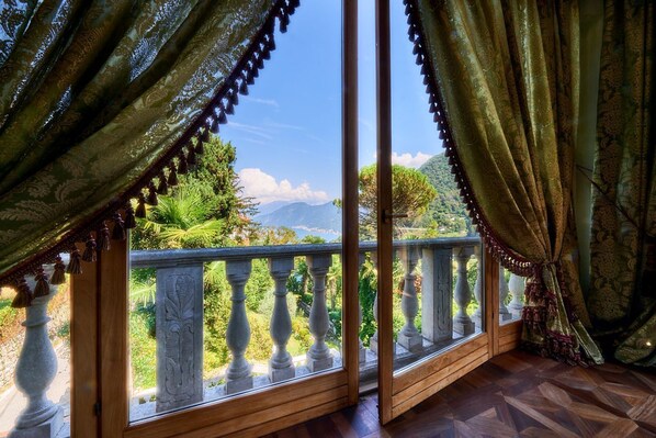 The fireplace room and all 3 bedrooms are decorated with natural silk panels from the best family manufactures on Lake Como, each with a unique view of the lake and mountains. The 18th century Murano glass chandelier that decorated the Chinese Embassy in Paris now adorns Villa Gina with its splendour.