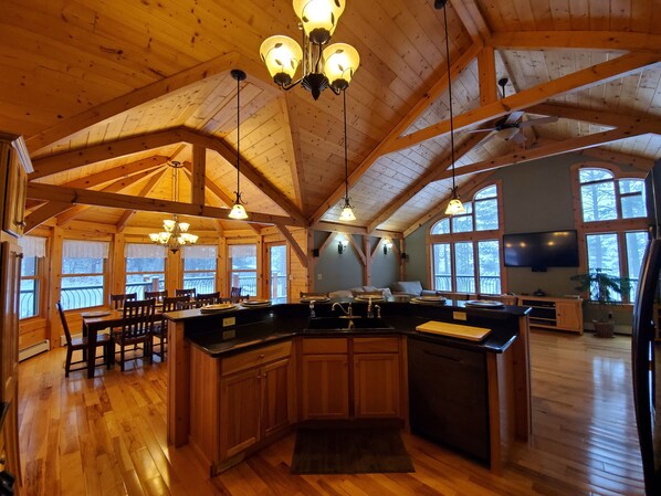 Das große Wohnzimmer hat gewölbte Decken, 42 'Flachbild-Satelliten-HD-TV mit einem Blue Ray DVD-Player, Surround-Sound-System und zwei ausziehbare Queen-Size-Sofas für zusätzliche Gäste. Es gibt eine surrond Sound-Stereo für Ihren Genuss und einen großen begehbaren Kleiderschrank für Ihr ganzes Zahnrad. Terrassentüren auf die große Fertiger walk-around-Deck mit Gartenmöbeln zum Sitzen und Entspannen eingerichtet geöffnet. Es gibt eine komplette Küche mit Geschirrspüler und ein Waschraum mit Waschmaschine und Trockner.